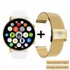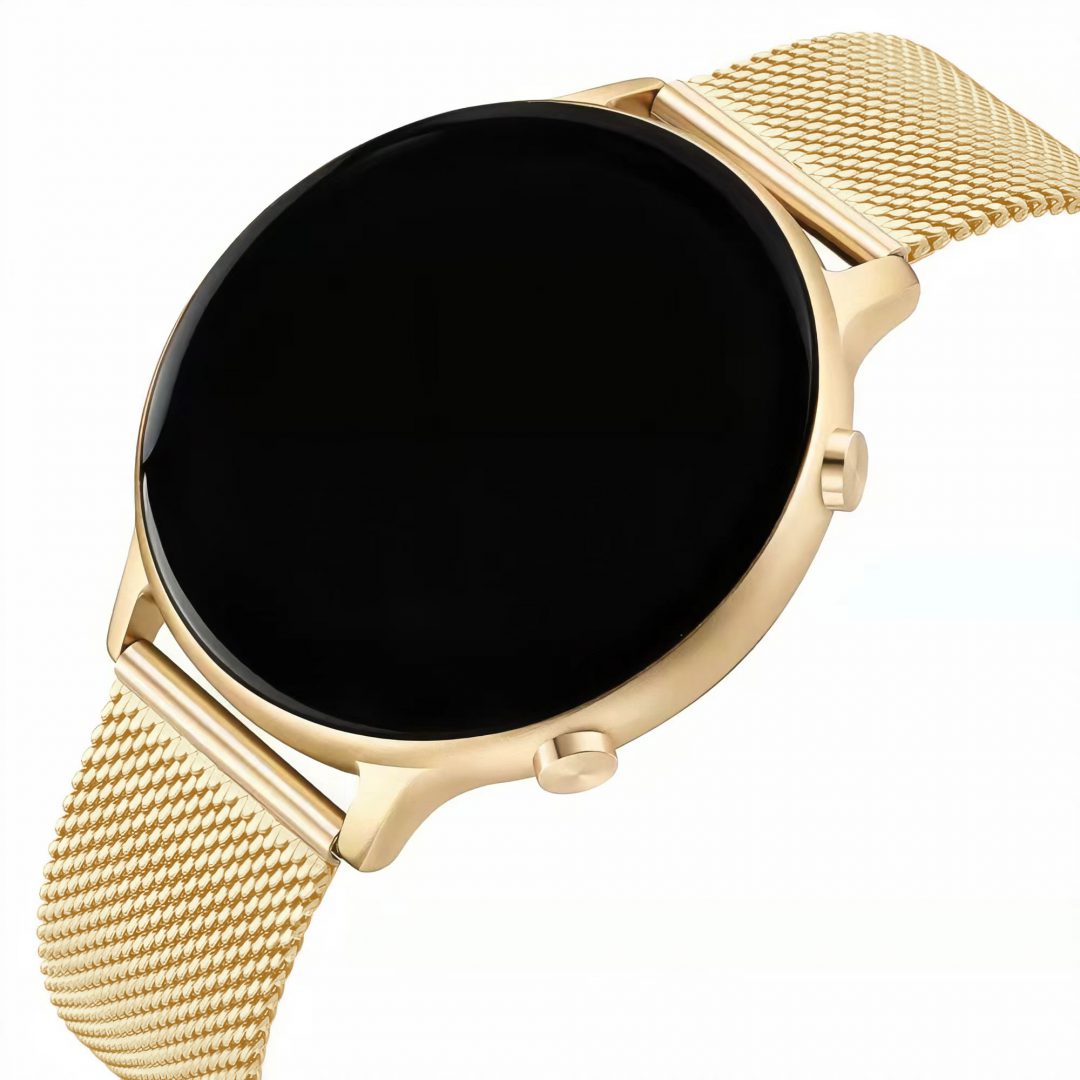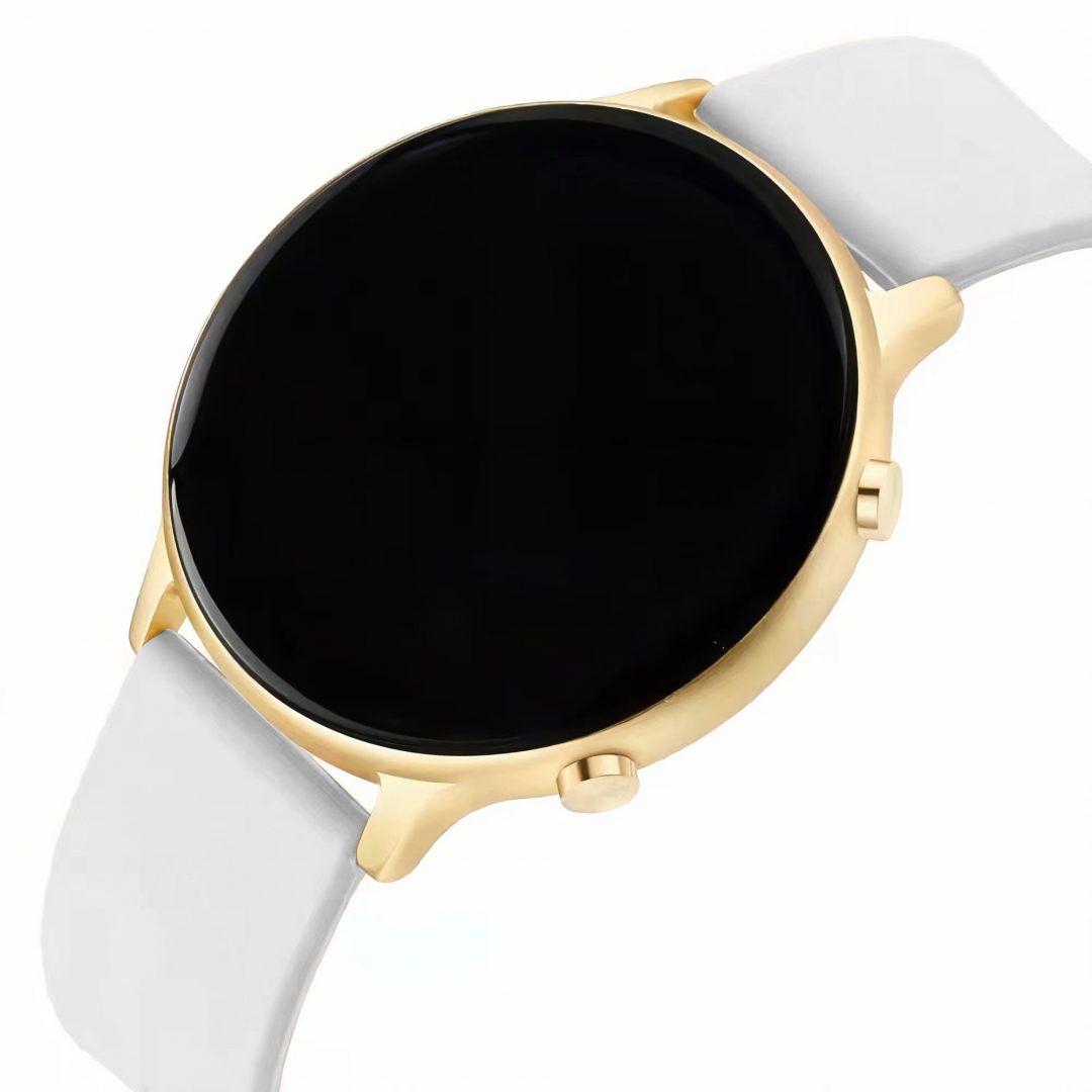 גוף השעון עשוי מפלדת אל חלד בצבע זהב צהוב בעל רצועת סיליקון ספורטיבית בצבע לבן עם אופציה להחלפת הרצועה לרצועת רשת Mesh זהב צהוב בעל לוח שעון טאץ’ עם מספר תצוגות מתחלפות וזכוכית מינרל חזקה ועמידה נגד שריטות
